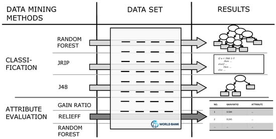 The framework of this paper is illustrated in Figure 1. In order to learn models that allow discrimination between above-average and below-average slum development, we applied three commonly used classification methods to the data set described above—the random forests ensemble classification method [28], the rule learner “ripper” [29], and the decision tree learner C4.5 [30]—in their implementations available in the Weka Knowledge Acquisition workbench [31,32]. Since Weka is an open source platform, the described approach can be applied to the presented data or other data by other researchers. We also conducted different types of attribute evaluation to identify factors that had a high influence on this discrimination [33], evaluate the different results, and compare them quantitatively. In this context, it is also important to note that the methods presented only identify correlations and links between the growth of slum population and the other different indicators. Our goal in this study was not to establish causal relationships between different indicators and slum growth, but to identify and quantify them.