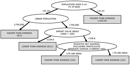 When looking at the model found with J48 for a timestep of 10 years (Figure 2), the first and second nodes contained demographic aspects, like the proportion of the population with ages between 0–14 and the total urban population. A high proportion of young people (more than 41.43 percent) correlated with a slum growth higher than average. If the proportion of young people was below the threshold mentioned above, the next node was to use the total urban populations as a decision criterion. The last two nodes were economic indicators. The import value index “is the current value of imports (c.i.f.) converted to U.S. dollars and expressed as a percentage of the average for the base period (2000)” [22]. If this value was below 238.6, the slum growth was classified as lower than average. If it was above, the last decision criterion was the value of the adjusted net savings. For detailed information on the indicators, please see [22].