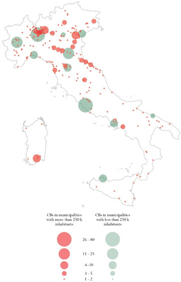 In line with the survey carried out by Deskmag in 2012 [27], which registered a relevant increase in CBs located in rural areas, our mapping of Italian CBs shows that there is a significant share of CBs located outside big municipalities, even though coworking maintains its urban character in large “hotspot” cities, as suggested by Moriset [6]. The spread of CBs to many small municipalities or medium-sized towns reflects the distribution of the population in Italy, where only few municipalities have more than 250,000 inhabitants [56]. Agglomerations at different scales, among smaller municipalities, around medium-sized cities and in large urban areas create opportunities for creative activities in many different locations, and the territorial distribution and concentration of CBs reflect those opportunities.