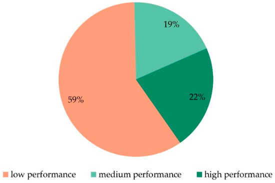 The indicator according to which we chose to evaluate the performance of CBs was the occupancy rate of open space desks. Based on this variable, we grouped the CBs into three performance categories. This resulted in 76 CBs associated with low performance, 24 with medium performance, and 28 with high performance (see the percentages in Figure 2).