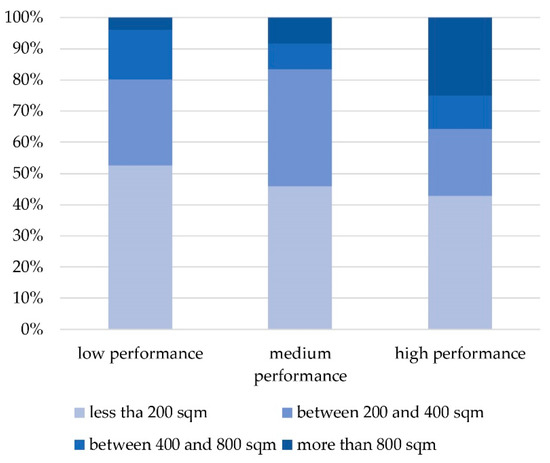 The second aspect we considered in relation to performance was the dimension of the CS provided in each CB. As summarized in Figure 4, a considerable share of high-performance CBs are characterised by a large CS: one in four high-performance CBs is bigger than 800 sqm, while only 4% of low-performance CBs are bigger than 800 sqm. Beside this, it is worth noting that almost half of the Italian CBs (49%) were found to be small.