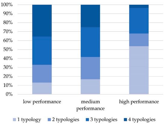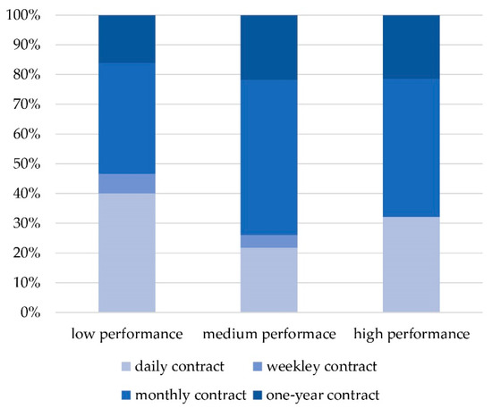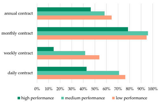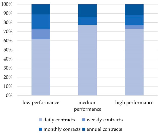 A third aspect investigated was the flexibility of the contracts offered to the users of the open space, represented by the different types of contracts (daily, weekly, monthly or annual) offered by each CB. As shown in Figure 5, the share of high-performance CBs offering four kinds of contract was substantially lower than the contracts offered by low-performance CBs: more than a half of the CBs turned out to offer only one kind of contract. Regarding the types of contracts offered (see Figure 6), the main differences between high-performance and low-performance CBs was the proportion of CBs offering daily contracts and weekly contracts, while the difference in proportion offering monthly contracts and annual contracts was much smaller.