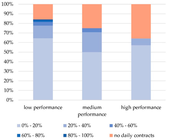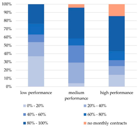 Monthly contracts (Figure 8) was the most profitable in each category of CBs. High profitability (80–100%) was obviously more frequent for high-performance and medium-performance CBs. In coherence with this data, a low level of profitability (0–20%) appeared more recurrently for low-performance CBs.