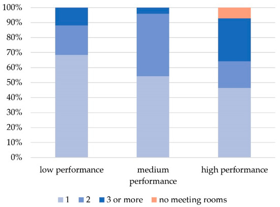 The presence of meeting rooms is another key element of CSs. High-performance CBs were found to have the highest number of meeting rooms (Figure 13). In fact, 29% of high-performance CB managers reported that their space is equipped with three or more meeting rooms, while only 12% of low-performance CBs arranged their spaces in the same way, as most of them were generally equipped with only one meeting room.