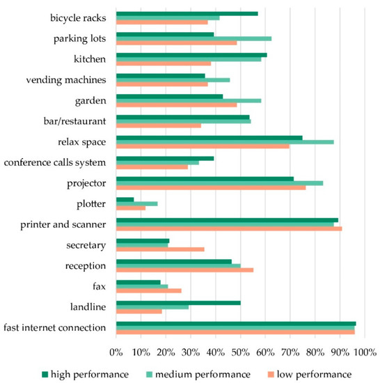 Some services, such as a fast internet connection and printers were found to be provided by almost every CB (Figure 14). For other services the analysis highlighted some differences between high-performance, medium-performance and low-performance CBs: the presence of a bar/restaurant and a kitchen could be observed more in high-performance and medium-performance CBs; the presence of a relaxation space, parking lots, a garden and vending machines was more frequent in medium-performance CBs; bicycle racks and landlines were services offered more commonly by high-performance CBs.