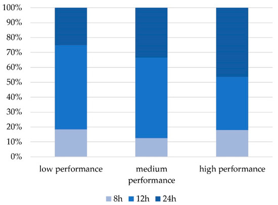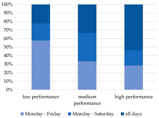 A significant number of high-performance CBs reported being open every day, while low-performance CBs tend to offer fewer opening days (Figure 15). The same situation was observed for the opening hours (Figure 16).