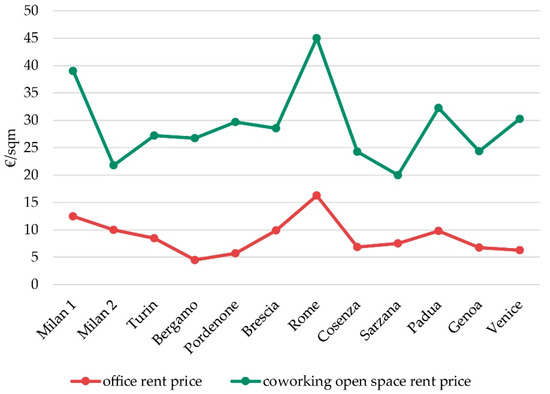 We now turn to the comparison of rental prices between traditional offices and coworking spaces, since in the literature the success and the diffusion of these new types of workplaces is related not only to better services, but also to their being a cheaper alternative to the traditional office. By looking at some of the coworking providers’ websites, we collected data on the open space surface and the relative monthly fees, considering the minimum monthly fee for renting a desk in an open space. Using this information, we then calculated the price per square meter, and we compared this value to that for traditional offices in the same area. The monthly rental price per square meter for offices can be found at the Italian Revenue Agency (Agenzia delle Entrate) webGIS, offering minimum and maximum prices for different areas [55]. We used the latest data available (year 2016, I semester), considering the mean between the maximum and minimum values. Other related useful information pertained to the quality of available spaces, as in some areas there are different prices according to the state of maintenance of the office spaces.