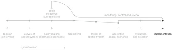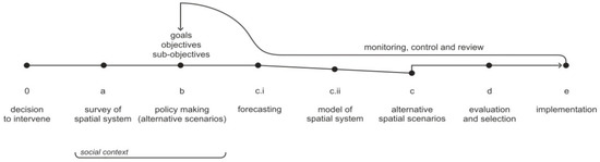 McLoughlin conceptualises planning as a process referring to a human ecosystem. It consists of the following stages (Figure 1—For a quite similar figure, see Muller [9] (pp. 141–142):