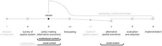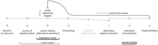 The elements of rational land-use planning, according to Faludi [6,10,11], in diagrammatic form, with the comprehensive model’s components in the background. White circle: coincidence with McLoughlin’s component. Gray circle: lack of the corresponding McLoughlin component. Below the axis: contextual factors.