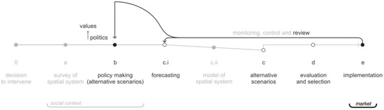 Figure 5 shows the methodological components of the incremental approach, on the basis of the preceding discussion, mapped against the background of McLoughlin’s proposal. The components that make sense only as applied to space are missing, as may be expected from a political approach, and thus the components (c) and (d) of the figure must be interpreted in a non-spatial, non-land-use, sense, but many of the other components of comprehensive planning are in fact exploited by incremental planning. There are two major components, policy making and implementation, and a contextual element is taken into account; this, however, is not Faludi’s institutional and social context, but the market, regulating the whole process as the context of implementation. Faludi, in his contrast of incremental and rational-comprehensive planning, attributes their differences to different conceptions of the bureaucratic planning system and concludes that the former is faithful to planning practice but should not be preferred, while the latter is a reliable and desirable ideal which is not unrealistic [11] (pp. 153–168).