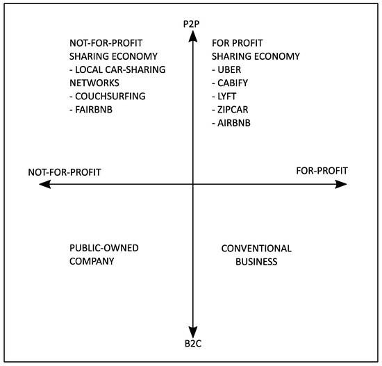 Some other authors notice some problematic issues concerning sharing economy, especially considering whether a sharing economy community works for profit or for solidarity reasons [1,13,16,17,18]. According to Alonso [13], many cases of the so-called sharing economy began with altruist purposes, but are really examples of ruthless egoism. Tom Slee’s book “Whats yours is mine”, an acid criticism on Botsman and Rogers [2] (2010), stated that the most significant examples of what used to be called the “sharing economy” are really giant corporations pursuing monopoly power and the “sharing” in the Sharing Economy has been reduced to simple market exchange [18]. According to this author, the appeal of a bottom-up, personal, community-driven alternative to traditional corporations have fizzled: we are left with Uber, a company financed by high-net-worth investors via Morgan Stanley and by Saudi Arabia’s Public Investment Fund, and Airbnb, by some measures the largest hotel company in the world [18]. It is clear that the sharing economy concept has become an umbrella for different practices that include for profit and not-for-profit economic practices, in which a variety of digital platforms, associations, social movements, and Internet activists play a role. Figure 1 summarizes this variety.