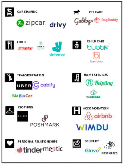 The distinguishing characteristic of modern capitalism is the expropriation of various facets of life into commercial relationships [17]. Today, with the expansion of digital platforms, every aspect of the daily routine, a tourism experience included, has become a purchased affair and an increasing commodification of all human experience. Few industries are exempt from potential disruptive change within the sharing economy [16]. A huge range of different digital platforms offers convenience services, as Figure 2 shows. Activities traditionally embedded in the family sphere, such as childcare, food or even pet care, are today possible to cover by different platforms, such as Bubble or Bambino that offer babysitters by the hour, Just eat or Deliveroo that permit ordering food to be delivered in less than 40 min, or Dogbuddy, offering different services of accommodation and care for pets. Even personal relationships appear today a lucrative business for digital platforms, such as Meetic or Tinder, that facilitate the possibility of flirting or finding new friendships without leaving home, or even meeting new people in a tourist destination when traveling. Finally, second-hand economy platforms have developed a new on-line market of shareable items. A majority of consumer goods can be understood as having excess capacity, including houses, cars, boats, houses, clothing, books, toys, appliances, tools, furniture, computers, etc.; all these items provide the consumer with an opportunity to lend out or rent out their goods to other consumers [21]. Over 10,000 new platform companies have sprouted and mushroomed in less than a decade [1].