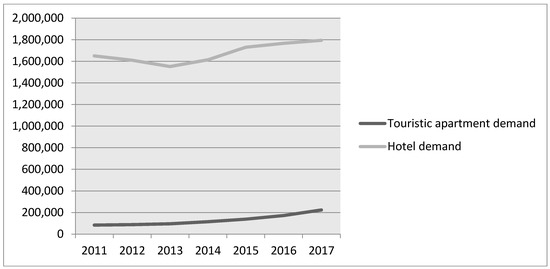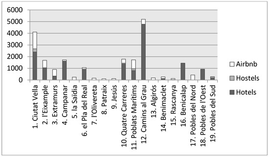This is one of the reasons that, despite the crisis, tourism marked historic records in Valencia in terms of tourism arrivals in Spain. According to Figure 3, short-term rentals in tourism apartments had an increase of more than 30% some months compared to the same period the previous years, whereas accommodation in hotels less than 7% [24]. Figure 4 shows the evolution of tourist demand in hotels and apartments in the last years in Valencia. Hotels continue to be the preferred accommodation option by the vast majority of tourists and concentrate today 71% of beds. Nevertheless, the growth in the number of apartments listed in Airbnb is spectacular, with an average annual increase of 200% and, in some central districts, such as Ciutat Vella or Extramurs, Airbnb offer is bigger than traditional hotel and hostels, as well as in the beach district of Poblats Marítims (Figure 5). These are the tourist hotspots in Valencia, where Airbnb is beginning to win the war against traditional accommodation options, but, even in less tourist areas such as Saïdia or Poblats del Nord, Airbnb is the only tourist accommodation possibility today. It is important to note precisely the change of trend in the years of the crisis: Hotel accommodation dropped between 2011 and 2013, but Airbnb offer increased notably those years (Figure 6).