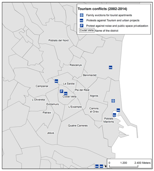 This shift towards digital platforms has already had an impact on the geography of conflicts in cities like Valencia. Figure 7 and Figure 8 show the main results of the carried out research on conflicts linked to tourism. Figure 7 show conflicts between 2002 and 2014, based on a conflict database from which tourism-related conflicts were extracted [28]. Figure 8 covers the 2014–2018 period as a result of the database on conflicts linked to tourism issues in the city of Valencia.