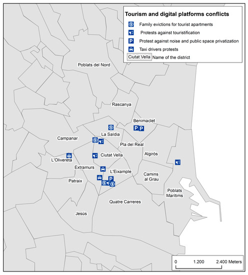 Figure 8 shows in total, 14 tourism-related conflicts reported through local media, all of them linked to Airbnb or transportation digital platforms, such as Uber or Cabify. Some examples of conflicts mapped here include the confrontation between the Entrebarris neighbor association in Russafa and a private company that bought an entire building and evicted seven families in the Russafa suburb, a very similar case in the Saïdia suburb, or the confrontation, even with physical violence, between taxi drives and Cabify and Uber drivers in tourism hotspots such as the main train station, or the High Speed train station. The other two types of conflicts represented in the map consist of a series of neighbor protests and actions against the touristification of some suburbs, and its consequences, namely more noise and widespread increase in tourism land-uses (hotels, restaurants, pubs, hostels, and of course, tourist apartments). Obviously, the stakes at conflict are not only tourism-related digital platforms such as Airbnb or Homelidays that threaten traditional tourist accommodation markets as well as the management and growth of the tourism sector in the city, but undoubtedly digital platforms are a key issue in this type of conflicts.