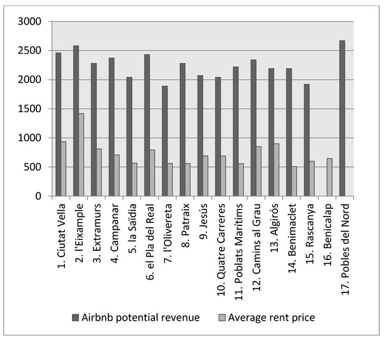 Airbnb potential revenue versus average rent price per district in Valencia, Source: [27,33].