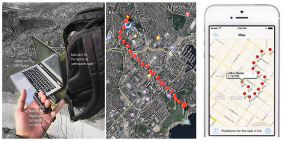 In this study, individual participants were asked to walk through a specific route in the city, while linked up to a galvanic skin response (GSR) device attached to their fingers and a GPS tracker app (Figure 4) in a backpack which they carried. Stress levels were measured using the GSR device which operates by detecting the subtle change in sweat secretion from eccrine sweat glands. Prior to the walk the quality of the GSR signal was checked in the visualisation software and the data feed was tested with the participant to resolve any potential issues and visualize the impact of breathing, movements, and talking.
