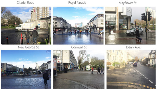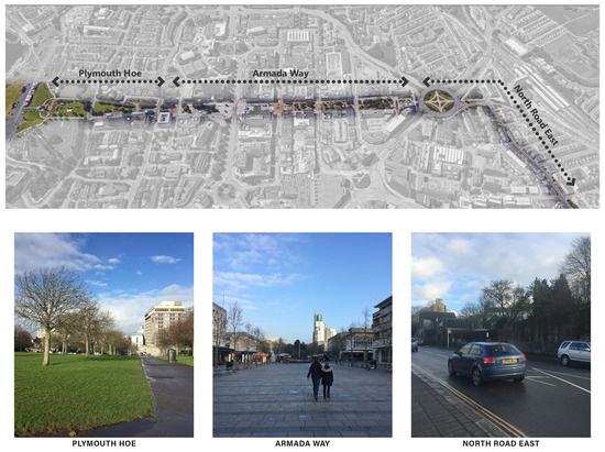 The route was chosen primarily because it covers three distinct areas in Plymouth City Centre. Participants were asked to walk from Plymouth Hoe, a popular recreational park in Plymouth, continuing their walk through Armada Way, a pedestrianized area, and ending at the North Road East (see Figure 6), a walk which took about twenty minutes in total. The urban spaces along the walk had different characteristics, ranging from the park at the beginning of the walk to a busy road at the end of the walk (see Table 1).