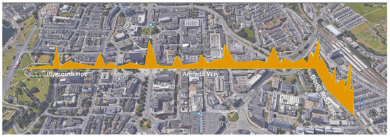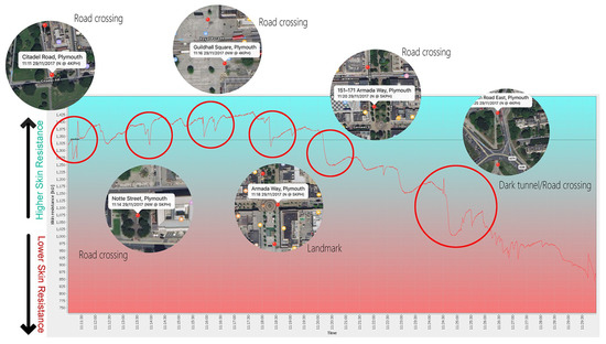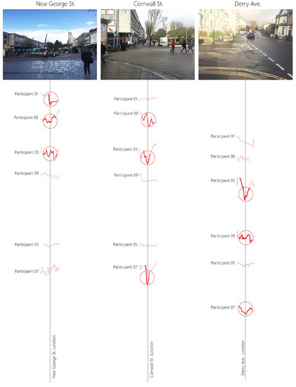 The participant’s data showed ‘peaks’ (that correspond to Bakker’s et al.’s findings [40]) that can be identified as sharp increases in stress levels whenever they encountered road junctions along the walk. In addition, the figure also shows that as participants walk from Plymouth Hoe to North Road East, their apparent stress level gradually increases, providing another an indication as to how different areas within the city affect the level of stress of their inhabitants.