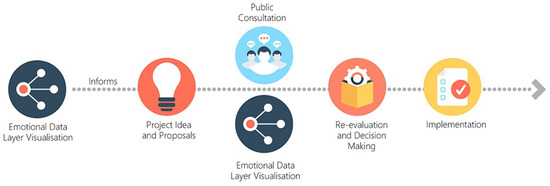 The study identified a correlation between emotional stress ‘peaks’ and urban design features and characteristics that could be used as a quantitative input into urban planning discussions. While this study is small scale in terms of the number of participants, the nature of the findings does indicate that the method could be replicated with larger number of participants to increase the level of data and coverage. Shoval et al. [35] recognised that products of such analysis “lead to important insights into how people perceive and interact emotionally with the urban environment; it can therefore be of great use in an improved planning process” [35]. Zeile et al. have acknowledged that their results can be used “as a source of information to help improve bicycle traffic planning and to identify peaks in urban planning deficiencies” [34]. The current model of planning allows for consultation, but this is limited in terms of modes of participation and the information layer (see Figure 1 earlier in this paper). The gathering of emotional data and the subsequent understanding gained from this analysis would help create a readily available layer of shared data (Figure 14) directly inputting into the urban planning process.