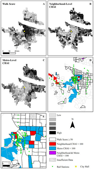 The spatial relationship between (A) walkability and housing affordability calculated at the (B) neighborhood and (C) metropolitan scale for census tracts within the urbanized area of Portland, OR. Of particular interest is where (D) relatively high walkability and low housing affordability overlap, most notably prominently around (E) the city center. The comprehensive housing affordability index (CHAI) was calculated by summing the standardized housing affordability for home owners and renters, and weighing each based on their proportion within each census tract.