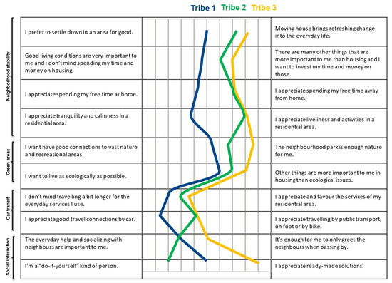 Profiles of three urban tribes based on the cluster centers [30]. Tribe 1: Urbanist (36%); Tribe 2: Semi-urbanist (29%); Tribe 3: Nature lover (35%).