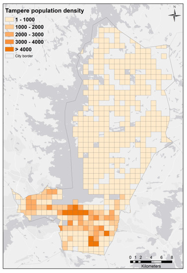 Population density within city of Tampere’s border. The 1 × 1 km grid cells were adopted from the Statistics Finland population dataset. Where needed, cells were clipped to fit the city extents.