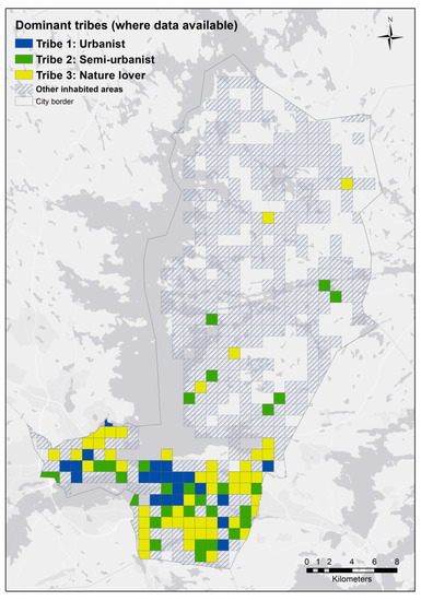 Figure 7 shows how the urban areas matching each tribe’s revealed preferences are geographically distributed. More than 77% of the city’s inhabited areas match Tribe 3’s (nature lovers) revealed preferences, with significantly smaller areas matching Tribe 1 (urbanists) and Tribe 2 (semi-urbanists), with 14% and 9%, respectively.
