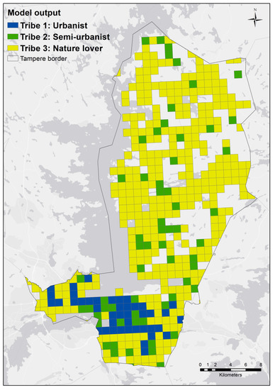 Using the fuzzy model developed in this study, we projected people’s revealed preferences to the whole city region (Figure 7). This was done by feeding the urban structural values into the model, which were calculated for each grid cell throughout the region. Based on the output of the fuzzy logic model, we identified the tribe that had the highest level of preference match with its urban structure for each grid cell.