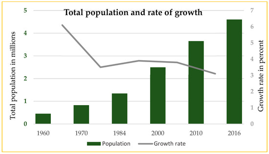 The region has one of the highest population densities in Ghana with a population of 4.6 million people as of 2016, with an average annual population growth rate of 3.5% between 2000 and 2010 [31] (Figure 2). The population is projected to more than double to 10.5 million by 2040 [9]. The region accounts for 25% of Ghana’s Gross Domestic Product (GDP). GAMA also accounts for 32% of formal urban employment and 28% of informal urban employment in the country [15]. It also has the lowest incidence of poverty across the country, with a rate of 5.6%, which is much lower than the national rate of 24.2% in 2011/2012. Income inequality has also improved over the last few years, with the rates falling from 41.9% in 2005/2006 to 37% in 2012/2013 [31].
