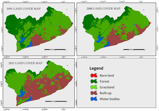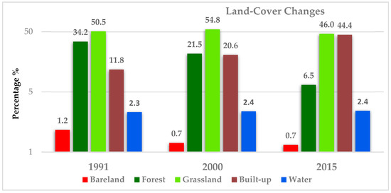 In exception of bare-land and grassland, the other land cover types were consistent in their direction of change from year to year (i.e., increasing or decreasing). The statistics revealed that built-up areas in the region have been drastically expanding, mainly at the expense of grassland. Forest areas in the region had the greatest loss, while grassland and water bodies exhibited very little change between 1991 and 2015. The analysis further revealed that, in 1991, grassland was the most dominant land cover type, covering 50.5% (80,079 ha.) of the study area. This was closely followed by forest, which covered 34.2% (54,258 ha.) of the area. Built up areas represented 11.8% (18,625 ha.) of the area, with water bodies also covering 2.3%. The remaining 1.2% of the study area were classified as bare-land. Table 4 shows the land-use percentage and area changes for the two study periods.