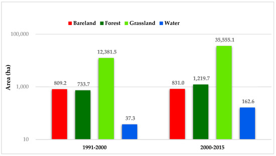 Of the five land cover types assessed, water bodies experienced the least change, although water resources in the region expanded marginally over the entire 25-year period. Water bodies covered 2.30% (3637 ha.) of the study area in 1991, expanding to 2.37% (3761 ha.) in 2000 and subsequently covering 2.42% (3832 ha.) in 2015. Between 1991 and 2000, water bodies in the region expanded by 124 ha. Water bodies also expanded by a net gain of nearly 70 ha. between 2000 and 2015. Grassland and forest were the biggest contributors to these minimal net increases.