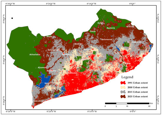 Based on the predicted future LULC map of the region, urban expansion is likely to continue unabated. The majority of the urban expansion projected to occur between 2015 and 2025 is extensions from the 2015 urban extent with many infills also being projected to occur within the urban core of the region. The majority of the urban expansion is expected to occur in the western and eastern sides of GAMA. Owusu [50] noted that settlements in the western and eastern part of GAMA have a higher growth rate than other parts of GAMA. In the south eastern part of the region, the townships of Kasoa and Weija are expected to grow towards each other and subsequently merge. Many of the non-urban zones within the urban core are exclusionary zones that were restricted from becoming urban during the modelling phase. Without these exclusionary zones, areas such as the Achimota forest reserve, University of Ghana, Weija, and Sakumo Ramsar sites would have been encroached by urban expansion.
