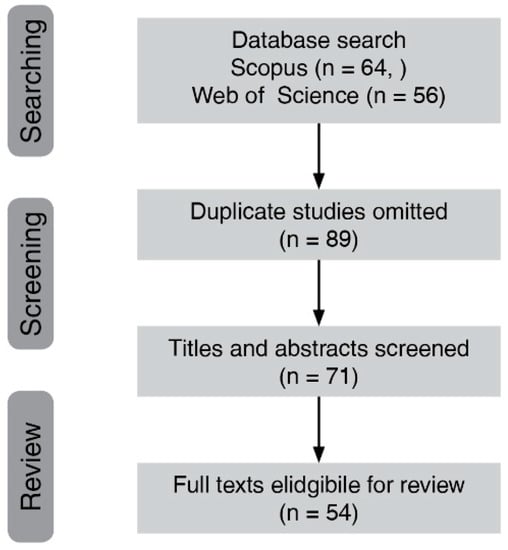 Scheme over search and filtering process. Starting from search of two databases for publications between 2000 and mid-2016 to screening and filtering before final review. From 120 articles in the initial search, the final number of articles included was 54.