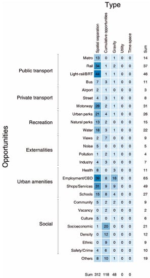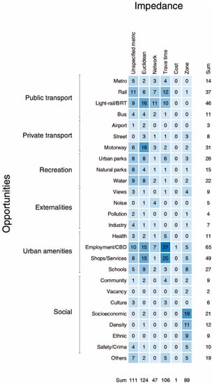 In this section, we will present the results following the review method that is discussed in Section 3 using three aspects of accessibility: type, opportunity, and impedance. In the following three result figures, these three aspects are presented in relation to each other. Instead of presenting the results in a three-dimensional graph (Figure 2), each plane in this three-dimensional (3D) graph is discussed separately: type-opportunities (Figure 3); impedance-opportunities (Figure 4); and, type-impedance (Figure 5). The numbers in the figure show the amount of times the specific combination of aspects of accessibility occur in the reviewed papers.