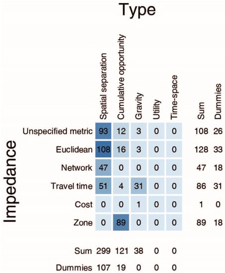 The frequency of the use of the specific combination of impedance and type in the reviewed sample of papers. The numbers in the figure represent the amount of times the combination opportunity-type is used; the darker blue, the more frequent this combination is used; the sum shows the total amount of times the impedance or type is used, irrespective of the other aspect. The list “Dummies” show how many times type and impedance variables actually are dummy variables.