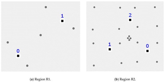 In order to explore the insights available from state space, we construct two hypothetical regions: region R1 with two retail zones (0 and 1) and five residential zones, and region R2 with three retail zones (0, 1 and 2) and 20 residential zones. Appendix A contains full details about each region. The spatial arrangement of zones in each region is shown in Figure 1.