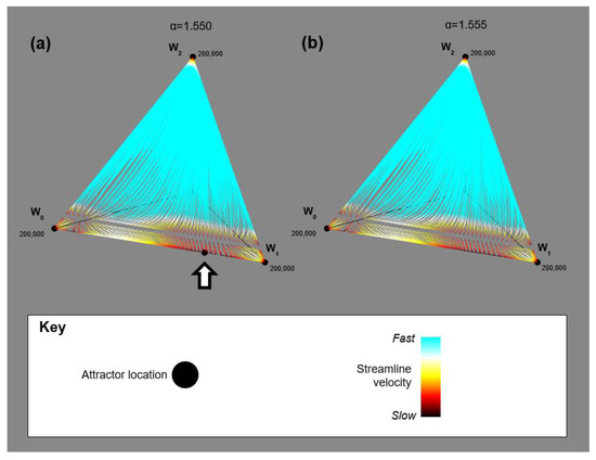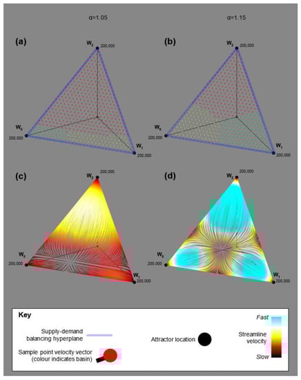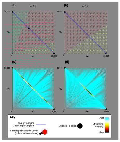 The attractors in the BLV model’s state space always exist on a supply-demand balancing hyperplane because the model is in equilibrium when (i.e., when total region spending power equals total running costs of all shopping centres combined). The streamlines in Figure 2c,d show how rapidly the two-zone system moves back to a supply-demand balancing hyperplane if the initial conditions are away from this. The lines use a colour ramp for slow to fast through black, red, yellow, white and cyan. The system is not necessarily at equilibrium when on this hyperplane but the equilibrium solutions are definitely somewhere on the hyperplane. The hyperplane is a system-level feature and when the system is away from the hyperplane the whole system will correct a supply-demand mismatch for the whole region by moving back to the hyperplane. Below the hyperplane there is undersupply of retail facilities in the region and above the hyperplane we have oversupply. The subsequent move to an equilibrium solution on the hyperplane then addresses supply-demand mismatches for each and every zone.