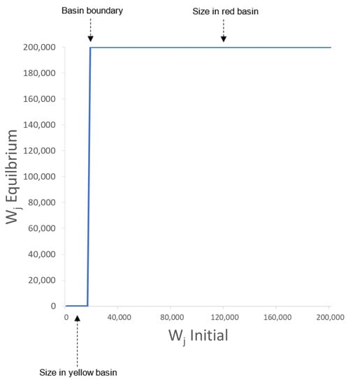 As already demonstrated, equilibrium-size graphs can in some cases identify a critical size below which a zone is not present at equilibrium. This study has allowed us to explain the graph in state space terms. This kind of analysis can help identify both types of causes for phase transitions as demonstrated in Dearden and Wilson [] where the critical size of a retail zone changes in this kind of graph when external conditions (the exogenous parameters) are modified manually—implying a basin boundary moving over the current initial conditions. This points the way forward for using the insights that state space offers in higher dimensional systems—the examples given in Wilson and Dearden [] work with a 215-dimensional retail system and explore different ways to present the data, e.g., plotting the critical size for each zone on a map of the retail system. Equilibrium-size graphs and the idea of a critical minimum viable size for a retail zone also help to explain how thin basins can occur along a state space edge where at least one zone is zero size across the whole basin—something regularly visible in the outputs of the BLV retail model state space software in use for this study.