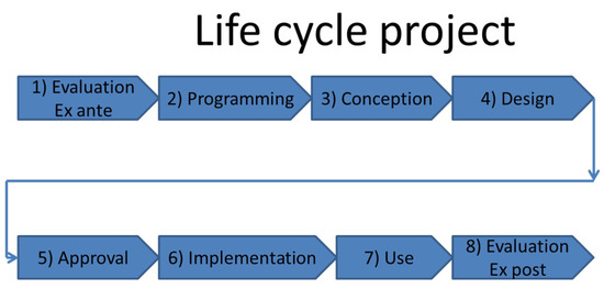 The redevelopment project of a territory structures its organization according to the stages of a construction project in general. The difference is that a brownfield redevelopment project has to take into account its past (land use), all the existing buildings (reuse and cultural interest) and the contextualization scale (urban or rural extra urban), along with the associated environmental issues. In our proposal, the urban redevelopment project is based on the same stages of the life cycle of a construction project. This perspective allowed us to include some fundamental steps in the life cycle of a project. Our proposal emphasizes that certain steps must be well-identified in order to achieve the expected goals at the end of the project. Figure 3 indicates the basic steps of a redevelopment project. It is clear that this scheme can be applied to any kind of urban project.