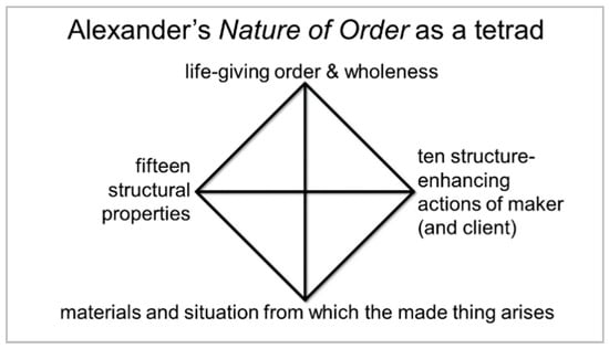 36]. I have argued here that J.G. Bennett’s explication of the tetrad provides one conceptual means to clarify and evaluate Alexander’s theory of wholeness and to demonstrate that it offers one integrated, comprehensive means for facilitating effective, creative designs and fabrications. During his professional life, Alexander has produced a remarkable body of work, which most succinctly can be described as the development of conceptual and practical ways to understand, to design, and to make wholeness. Throughout his many writings, he has presented wholeness in different ways, and I have argued here that interpreting his work via J.G. Bennett’s tetrad allows one to see an underlying continuity both in terms of successful design process as well as conceptual and practical means for assuring successful design outcomes.