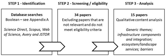 The searches were conducted using Boolean functions to combine keywords and phrases (Appendix A). Searches included terms that defined the setting, e.g., ‘street’ or synonymous words, AND the term green infrastructure, or synonyms (e.g., green network), OR components of green infrastructure (e.g., tree); OR green infrastructure functions (e.g., biodiversity). Street grey infrastructure studies were identified in the same way with the term defining the context combined with the term grey infrastructure or synonyms (e.g., infrastructure), OR components of grey infrastructure (e.g., sidewalk) OR their functions (e.g., street calming). Searching ended when duplicates of previously downloaded citations dominated the search results [36]. The resulting 34 papers were screened using the PRISMA process described by Moher, et al. [37]. Figure 2 shows a diagrammatical representation of the methodology we applied
