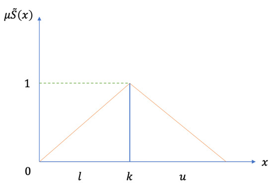 From Equation (1), and mean the lower and upper bounds of the FN , and is the modal value for (like Figure 2). The triangular fuzzy numbers (TFN) can be denoted by . The operational laws of TFN and are displayed in Equations (2)–(6).