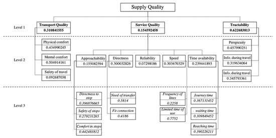 The determined FWs were slightly surprising for the municipality transport experts at all levels. As will be seen in the following, for sustainable development, the public preferred other issues than those that might have been expected. Figure 3 exhibits the final FWs for all elements of the supply quality structure. Even for the first level, the result is surprising; the public did not prefer common issues to be improved, such as transport quality or service quality, but the largest weight belonged to the tractability criterion (Table 2). Based on this, the municipality should not support those projects that endeavor to develop the traditional public system; e.g., purchasing new vehicles or changing routes of the lines. In the specific case of Mersin, providing information on the timetables in an efficient and understandable way would attract more people to use public transport.