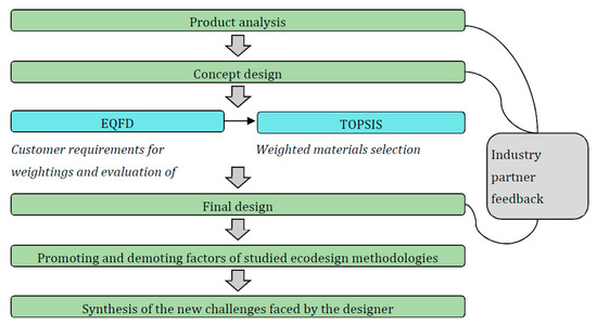 The goal of this study is to find repeating patterns from the studied ecodesign methodologies, that affect the chances of RMCs to be chosen. A vast range of ecodesign methodologies exists, and for this study, two different methods were chosen as the framework. An extensive work called the eco-tool seeker by Rousseaux et al. (2017) [26] was used to identify ecodesign methodology through which the case study product would be put through. It was discovered that international sectoral ecodesign standards relating to the case study were not available; therefore, it was decided that a combination of two methodologies would be used. Environmental Quality Function Deployment (EQFD) [27,28] for the environmental criteria, and weightings and Technique for Order of Preference by Similarity to Ideal Solution (TOPSIS) for numerical material comparison [29]. The case study helps to understand the factors influencing the materials selection process in a functional context, where the material properties and characteristics of the product are taken into consideration. The chronological structure of the study framework is presented in Figure 1.