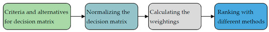EQFD combined with multi-criteria decision analysis has been used to assess sustainability and materials selection with multiple constraints [29]. Multi-criteria analysis methods with weight factors are often employed when the group of possibilities is large and conflicting design objectives are ranked. House of Environment (HoE) is used to weight the different criteria and it has been employed in several ecodesign studies [27,28,30,31]. A voice of the customer (VoC) structured interview was conducted in a Finnish company that manufactures and sells heating and cooling solutions. The respondents were experts working closely with underfloor heating business-to-business customers. Respondents were asked to answer how would they evaluate different requirements given to the product from a customer’s point of view (a EQFD scale of 1, 3, and 9 was used). The questionnaire featured a list of expected customer and environmental criteria, a similar approach has been applied to composites by Mastura et al. (2017) [32]. Answers to the VoC questionnaire were two-fold, as the presence of ecological factors was seen positively, but at the same time concerns were raised about how much the contractor customer values the ecological criteria over cost. Environmental criteria was seen as important, as long as it does not affect the functionality negatively or increase the price of the product. A House of Quality (HoQ) table was developed from the VoC questionnaire results, and the customer requirements were translated into metrics, of which the dependencies of requirements were cross-checked and the technical importance ratings (TR) and relative weights (Rw) were calculated. The EQFD metrics and component matrix relative weights (RWM) were used as an input for the functions and components matrix, where the concepts were also compared against the main functions that the product should fulfil. Functions and components relative weight (RWF) indicates which functions the designs mostly focus on. The main phases of the TOPSIS material selections procedure following the EQFD are shown in Figure 2.