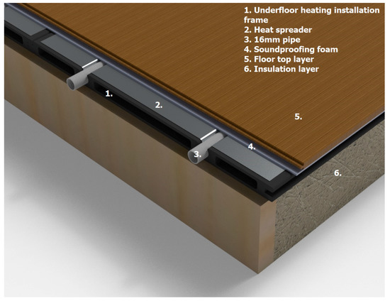 The final concept prepared for the case study design is presented in Figure 3. The design takes advantage of the higher strength of composite plates for a longer assembly span and low installation height. The product could be especially useful in retrofitting suspended underfloor heating in renovation cases. The extruded profiles should be clearly marked so that the components of the composite would be recognizable for future recycling.