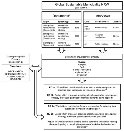 The analysis in this paper is divided into two parts. The first part reports on a case study of the German pilot project “Global Sustainable Municipalities NRW” described in the previous section with the goal to assess the current status of the use of citizen participation formats for adopting local sustainable development strategies (RQ 1). For the qualitative analysis of this project we rely on (1) published reports of the participating municipalities as well as (2) qualitative interviews with responsible persons of the project. Figure 2 summarizes the types of sources used for the analysis. Each participating city or district in the pilot project had to document their path towards the sustainable development strategy. A rough structure for this report was given by the project lead (LAG 21). It entailed a description of the corresponding municipality, information on involved stakeholders, details about each phase of the adoption process of the strategy (Figure 1) and the sustainable development strategy itself with the defined goals, measures and indicators. Nine of the analyzed strategies were from municipalities, and two from districts. In addition, a complete documentation of the overall project is available. The documents were read by the authors and each reference on citizen participation, discussed topics and other aspects like knowledge sharing or communication modes were marked. In a second step, we reached out to the responsible contact persons for these sustainable development strategies, in order to learn more from their experiences and challenges with citizen participation formats during the design process of the sustainable development strategy. We conducted interviews via telephone with three responsible persons from two municipalities and one district, for which we used a semi-structured questionnaire (see Appendix A). The interviews took place in October, 2019, each of which lasted about 30 min.