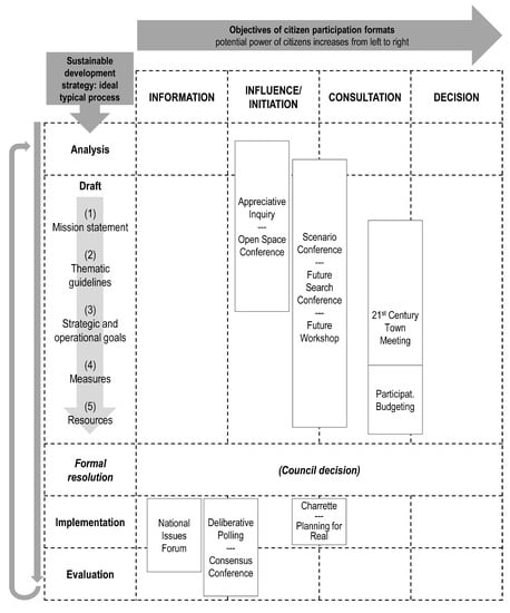 Citizen participation can take several forms. There exists a variety of different participation formats, including different target groups and objectives, as well as facilitating different levels of power on the parts of the participating citizens. The “Ladder of Citizen Participation” [18] differentiates between eight types of participation and non-participation: manipulation, therapy, informing, consultation, placation, partnership, delegated power and citizen control. In that order, an increasing power of citizens can be detected. Furthermore, various participation formats are suitable for problems and topics on different abstraction levels. With regard to the design and implementation of sustainable development strategies, not every participation format may be a meaningful contribution to each of the phases. Based on the format of choice, the citizens’ decision-making power differentiates. Hence, “one of the main challenges is to measure the degree of influence that citizens have had on a decision-making process” [19] (p. 207).