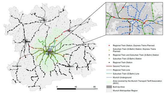 - Kreibich, V. Die Münchener S-Bahn als Instrument der Wachstumsentwicklung. In Dortmunder Beiträge Zur Raumplanung—Raumplanung und Verkehr; Ruppert, E., Ed.; Institut für Raumplanung (IRPUD), Abteilung Raumplanung, Universität Dortmund: Dortmund, Germany, 1978; Volume 4, pp. 293–314. [Google Scholar]